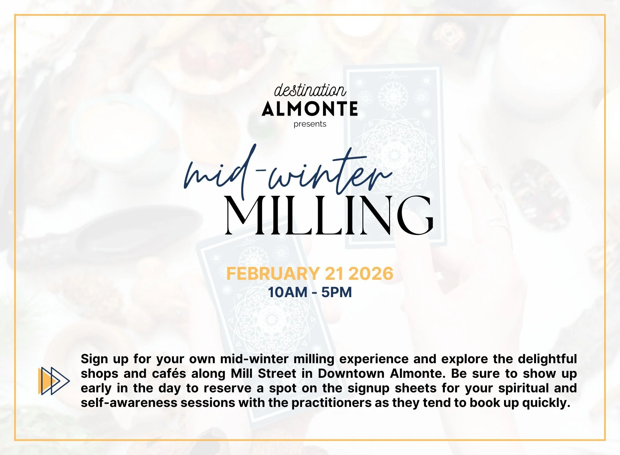 Join Destination Almonte for a mystical day of Mid-Winter Milling on Saturday, February 21st 2026 from 10AM to 5PM. Experience the magic as psychics, mediums, card readers, and more gather in Downtown Almonte for this much-anticipated event.