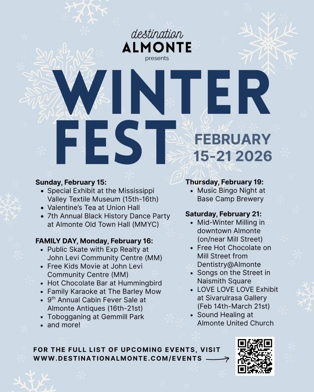 Festivities begin on Family Day weekend and lead us to the coveted Mid-Winter Milling. There are planned activities from the town of Mississippi Mills, Destination Almonte, members and local businesses, and more to come.